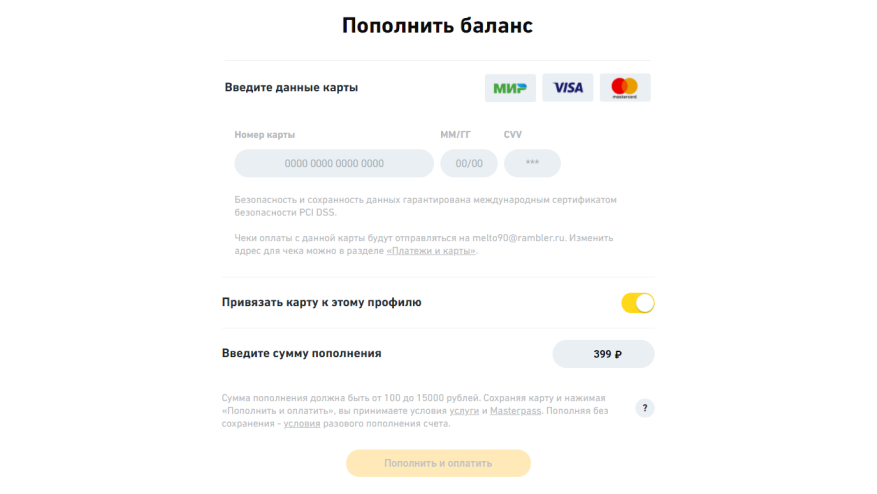 Введите данные вашей банковской карты. Нажмите кнопку «Пополнить и оплатить».